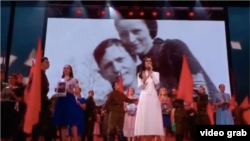 Снимок продемонстрировали на экране, когда на сцене певица Зара исполняла песню "Если б не было войны". По замыслу фотографии должны были показывать пары, которые разлучила война.